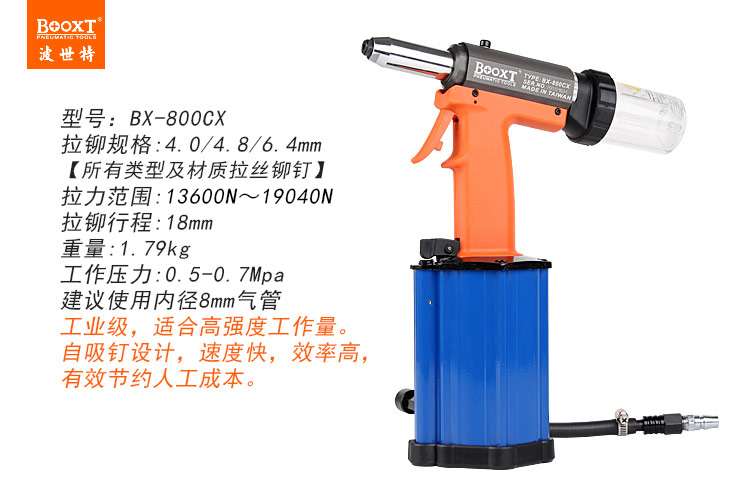 東莞市強勁五金工具有限公司提供臺灣BOOXT波世特品牌氣動工具,氣動拉釘槍BX-800CX廠家直銷,首件享特價。咨詢熱線:4008301980
