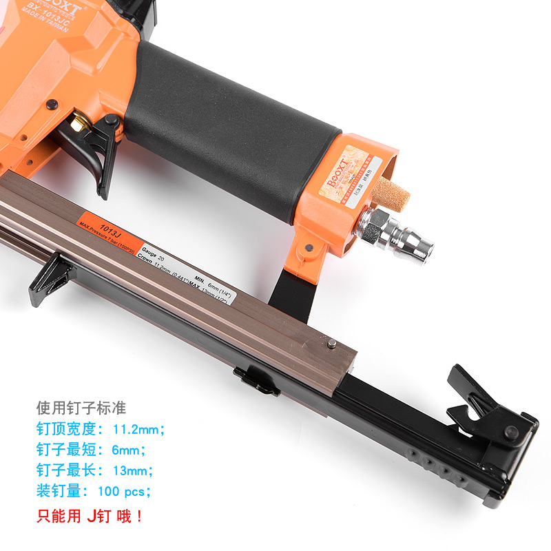 • 產(chǎn)品參數(shù): 特點(diǎn):自帶防誤打安全開關(guān);釘子寬度:11.2mm;釘子跨度:10mm;釘腳尺寸:0.58×1.15mm;使用釘子長(zhǎng)度范圍:6-13mm;裝釘量:100個(gè);使用工作氣壓:0.6Mpa;推薦使用內(nèi)徑6.5mm氣管;平時(shí)多注意定時(shí)排放空壓機(jī)水份