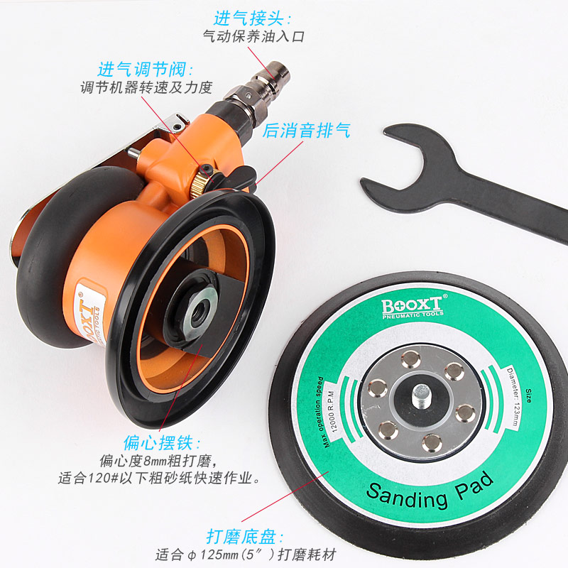 • 產(chǎn)品參數(shù): 底盤尺寸:5寸(125mm);空載轉(zhuǎn)速:12000rpm;偏擺直徑:8mm;重量:0.84kg;耗氣量:0.53m3/min;工作使用氣壓0.65Mpa,推薦使用8mm內(nèi)徑氣管,使用時(shí)多加氣動油保養(yǎng)。