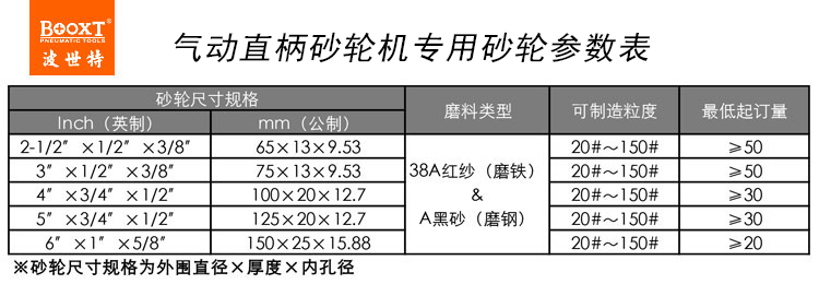 此文關(guān)鍵詞:氣動直柄砂輪機(jī)用砂輪,風(fēng)動直式砂輪機(jī)用砂輪,BOOXT直銷