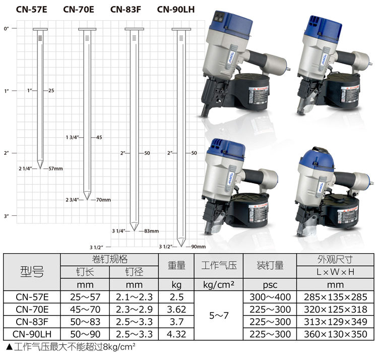 進口氣動卷釘槍CN-90LH特點: