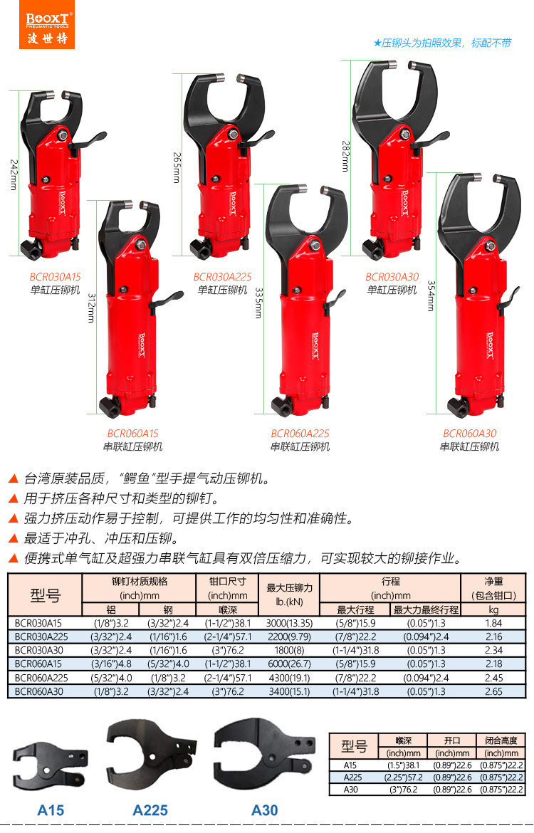 東莞市強勁五金工具有限公司提供臺灣BOOXT波世特品牌氣動工具,鱷魚口氣動壓鉚槍BCR030A225廠家直銷,首件享特價。咨詢熱線:4008301980