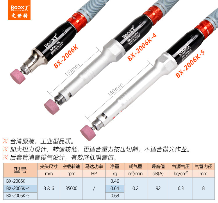 東莞市強(qiáng)勁五金工具有限公司提供臺(tái)灣BOOXT波世特品牌氣動(dòng)工具,加長(zhǎng)氣動(dòng)打磨筆BX-2006K-4廠家直銷,首件享特價(jià)。咨詢熱線:4008301980