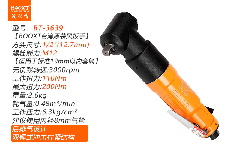 東莞市強勁五金工具有限公司提供臺灣BOOXT波世特品牌氣動工具,彎頭氣動沖擊扳手BT-3639廠家直銷,首件享特價。咨詢熱線:4008301980